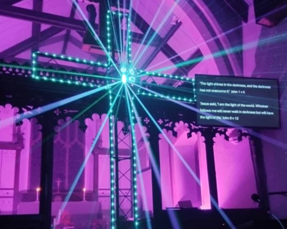 The interior of the church became a space of contemplation and wonder. At its center stood a large steel cross with an attached disco ball fragment, casting colorful light beams throughout the sanctuary as laser light danced across its surface. Bible verses appeared on screens while ambient music and the gentle scent of incense created a multisensory environment. This thoughtful design transformed the church from a place some might only visit for formal services into an accessible sacred space that welcomed everyone – including those in Halloween costumes. As one volunteer poignantly observed, “In the light of the cross, it didn’t matter” what anyone was wearing or where they came from – the experience transcended those external details.